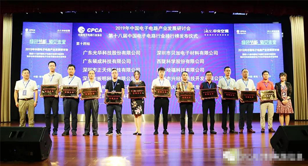 2019年中國(guó)電子電路產(chǎn)業(yè)發(fā)展研究會(huì)暨第十八屆中國(guó)電子電路行業(yè)排行榜頒獎(jiǎng)典禮在青島舉行,中國(guó)電子電路行業(yè)協(xié)會(huì)(CPCA)發(fā)布了2018年P(guān)CB行業(yè)百?gòu)?qiáng)企業(yè)榜單,廣東哈�?萍加邢薰救氚瘛�